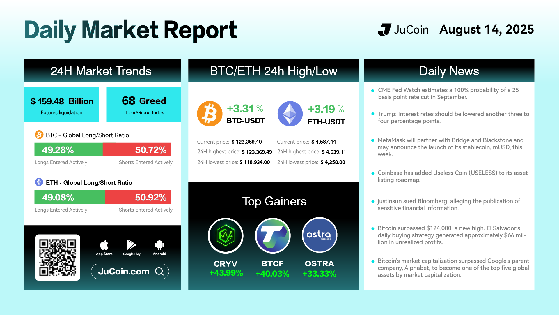 Crypto markets traded higher over the past 24 hours, with total market capitalization climbing to $159.48 billion. Sentiment strengthened as the Fear & Greed Index rose to 68 (Greed). Bitcoin (BTC) led the gains, rising 3.31% to close at $123,369.49, after testing a high of $124,474.01 and a low of $118,934.00. Ethereum (ETH) also advanced, adding 3.19% to finish at $4,726.25, moving within a range of $4,570.77 to $4,783.84. Futures positioning remained slightly skewed toward shorts, with BTC at 49.28% long vs 50.72% short and ETH at 49.08% long vs 50.92% short.